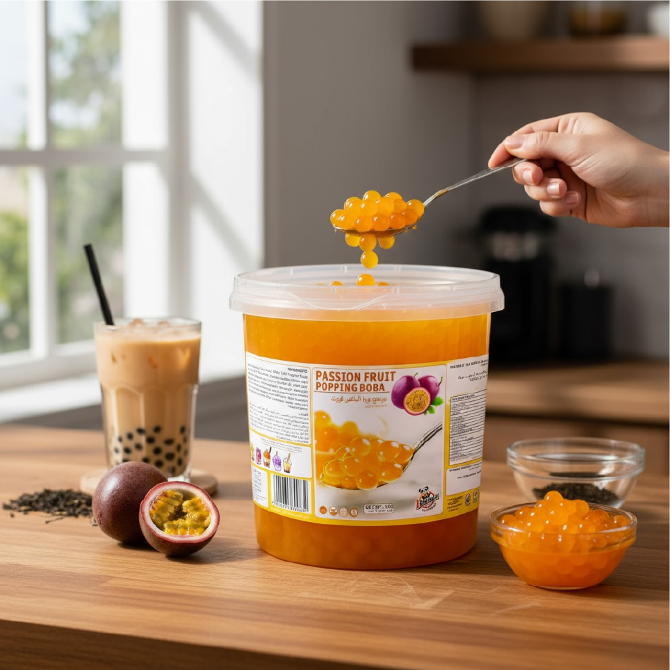 بوبا پاپینگ پشن فروت، ترکیبی بینظیر از طعم ترش و شیرین این میوه استوایی را در خود دارد. این مرواریدهای آبدار با پوستهای لطیف از عصاره جلبک دریایی پوشیده شدهاند و هنگام گاز زدن، طعم خوشمزه و تازهای از پشن فروت را آزاد میکنند. گزینهای عالی برای افزودن طعم استوایی به چایهای میوهای، اسموتیها، کوکتلها، دسرهای یخی و بستنیها.