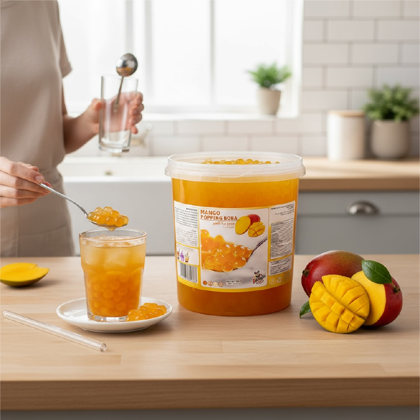 بوبا پاپینگ انبه، با طعم بینظیر و استوایی انبه رسیده، یک انتخاب عالی برای افزودن جذابیت و طراوت به نوشیدنیها و دسرهای شماست. این مرواریدهای خوشطعم، با پوستهای لطیف از عصاره جلبک دریایی پوشانده شدهاند و هنگام گاز زدن، انفجاری از طعم شیرین و طبیعی انبه را در دهان ایجاد میکنند. مناسب برای چایهای میوهای، اسموتیها، نوشیدنیهای گازدار، بستنیها و سایر دسرها.